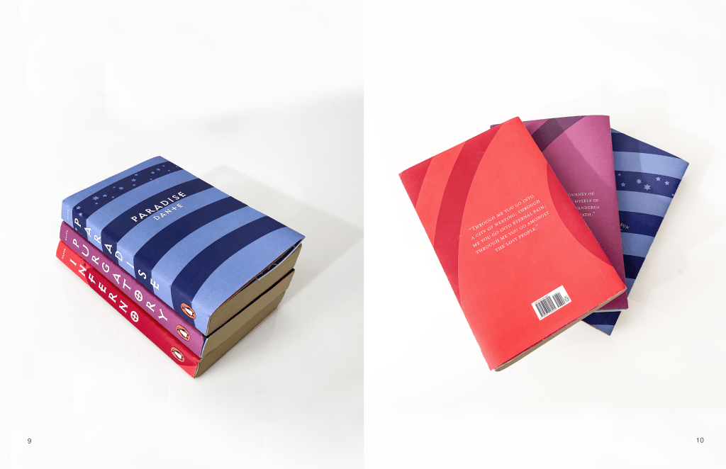 The Divine Comedy is a trilogy written by Dante Alighieri in 1320 about his imagined travels through the many levels of Hell, Purgatory, and Heaven. From personal experience reading these books as a high school student hundreds of years after they were written, they can be confusing. I went into this project with the goal of aiding the reader’s understanding with my design.