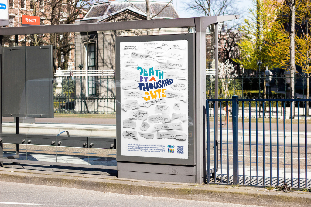 Concept: Micro-aggressions are, well, micro. Viewed individually, they can seem so minor, but again and again over time, they can seriously damage a person’s mental health and wellbeing. I used repetitive visuals and headlines like “death by a thousand cuts” to get this point across.