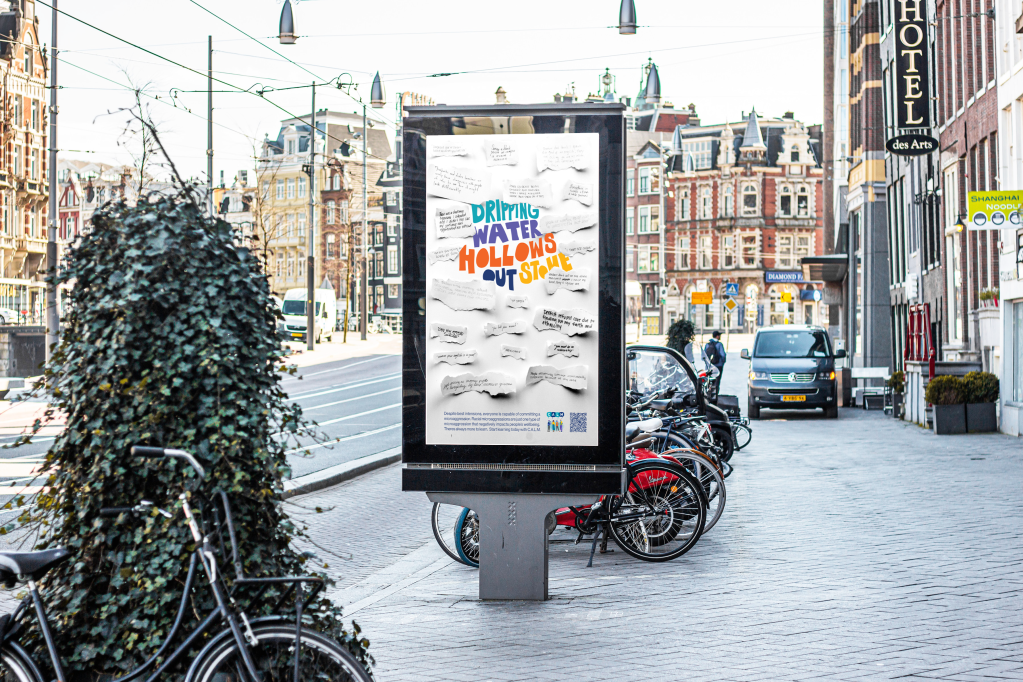 Design Choices: My solution to draw viewers in was to create something visually interesting and unique, but friendly. To connect with the audience and land the message once I have their attention, I let real people and their stories take the lead. Each piece of torn paper is a real, direct response I received. I overlapped and filled the frame to emphasize the repetition. The final campaign has a friendly and playful tone to encourage empathy and create an environment where people can be forgiven and learn from their mistakes.
